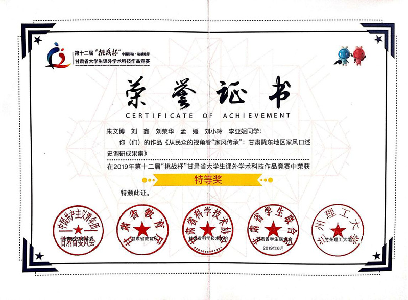 6月29日,第十二届“挑战杯”甘肃省大学生课外学术科技作品竞赛终审决赛在兰州理工大学兰工坪校区举办,我校多项项目在竞赛中取得了较好的名次。其中,世俱杯官网2015级本科生朱文博同学主持的项目《从民众的视角看“家风传承”:甘肃陇东地区家风口述史调研成果集》荣获特等奖,项目指导老师尚季芳教授获优秀指导教师荣誉称号。