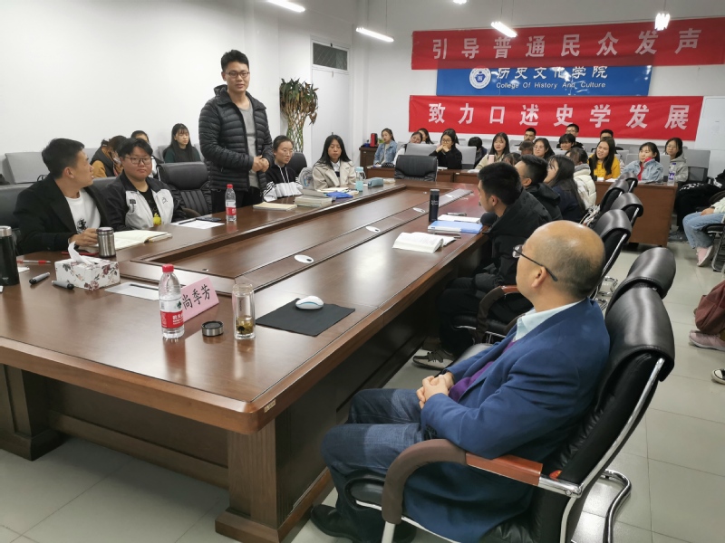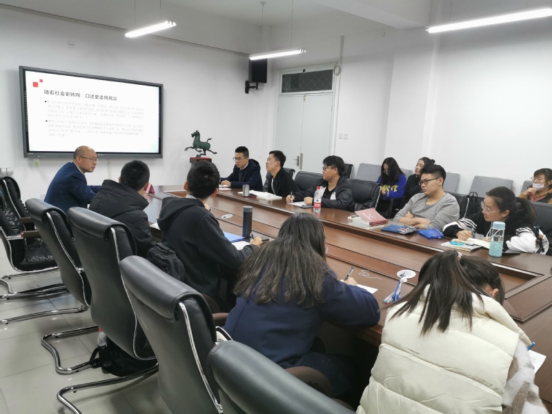 首先尚季芳教授对口述史协会的精神进行阐释,他总结为“奋进,有担当,有使命”,进而对口述史的发展与现状,价值与功用,选题与操作和论著与典范进行讲解。他讲道:“口述史,离我们最近的史料”,我们应该积极的利用口述历史调研的方法对身边的人进行采访。活动期间尚季芳教授与同学们亲切互动,讨论口述史方面的理论与实践。杨喜红同学与王昆同学就自己的实践经验向大家做了分享,同学们尚有疑惑的地方尚老师和两位学长耐心做了解答。最后尚季芳教授希望大家积极投身口述史历史研究,积极参加社会实践,锻炼自己。