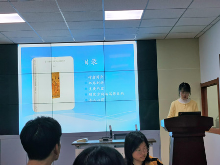 在陈老师开场白之后,第一位报告同学马芳芳,首先从“宠”这个字的释义切入,认为“宠”是指上对下的偏爱,接着分别对“偏”与“爱”进行了细致入微的分析;与此关联,她对“信”与“任”和“任”与“用”进行了详细阐释,带同学们进入学术思考。接着,她从品位与职位视角对不同才干的臣受“宠”情况做了分析。在对几个概念进行厘清的基础上,她对本书内容进行了概述。