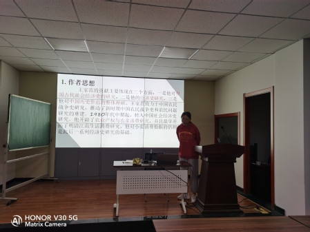 马相兰同学从内容概要、部分内容分享、读后心得、结语四个方面进行了读书分享。对农业起源、小农经济的历史合理性、农业发展进程等方面展开分析论述,最后提出并尝试解答了“是什么阻碍经济变革”的问题。马强同学对于“小农经济存在的合理性及局限性”、“卡里斯玛”型崇拜两个方面的内容展开论述。他对作者王家范先生的论点提出了自己的相关见解,并以江南经济为例,对“小农经济为什么阻碍经济的发展”作出解释。此外,他对“圣君光环”和“卡里斯玛”型崇拜进行自己的理解性分析。孔爱珍同学首先对作者的思想进行了详细介绍,让同学们更好地了解作者的写作背景;其次,对本书的章节及主要内容进行了概括性地说明;最后,重点讲述了“农业产权性质及演进”这章的内容,从“独立”与“自由”两个方面进行自己的见解和认识。腊红红同学先对该书的绪言、前编、后编、续编做了简单的总结,之后分享了自己读书的心得体会——通史观、时间线索与要素线索、中国何以走出中世纪,最后分享了几本参考书目——吕思勉《中国通史》、司马迁《史记》,有助于同学们更好地理解中国历史,从而形成一套完整的理论体系。陈来虎老师对以上同学的分享分别进行了点评。