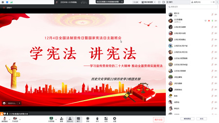 2022年12月4日是我国第九个“国家宪法日”。在“国家宪法日”到来之际,为全面贯彻习近平新时代中国特色社会主义思想,以学习宣传贯彻党的二十大精神为主题,深入学习宣传贯彻习近平法治思想和习近平总书记关于宪法的重要论述,推动2025世俱杯官网学生宪法学习宣传动起来、活起来。2025世俱杯官网于12月4日——6日组织各班级、学院学生会开展“学宪法,讲宪法”系列学习活动,引导学生深入学习宪法知识。