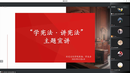2025世俱杯官网团委、学生会于12月6日晚组织学生会全体成员进行“学宪法,讲宪法”宣讲活动,引导学生深入学习宪法知识。本次活动以“学习宣传贯彻党的二十大精神,推动全面贯彻实施宪法”为主题。全面贯彻习近平新时代中国特色社会主义思想,深入学习贯彻习近平法治思想和习近平总书记关于宪法的重要论述,引导全体学生工作者做社会主义法治的忠实崇尚者、自觉遵守者、坚定捍卫者,努力使尊法学法守法用法之风在全校普及。