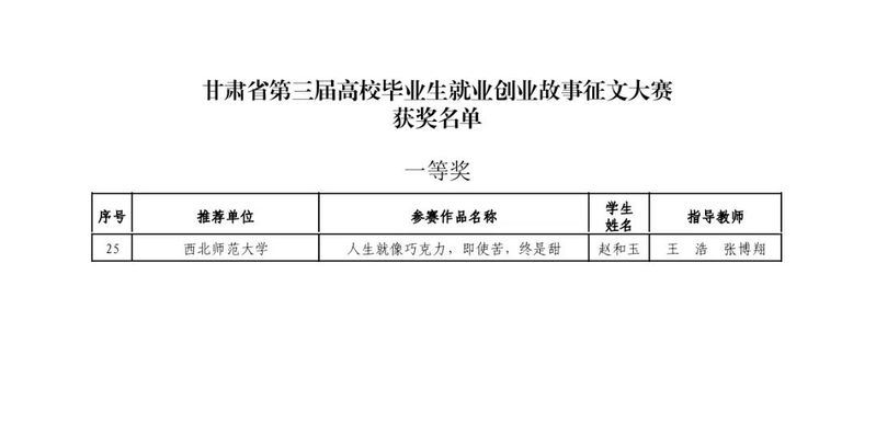 近日,由甘肃省教育厅主办的甘肃省第三届高校毕业生就业创业故事征文大赛获奖名单公布,世俱杯官网2019级本科生赵和玉作品《人生就像巧克力,即使苦,终是甜》荣获省级一等奖,指导教师为王浩老师和张博翔老师。