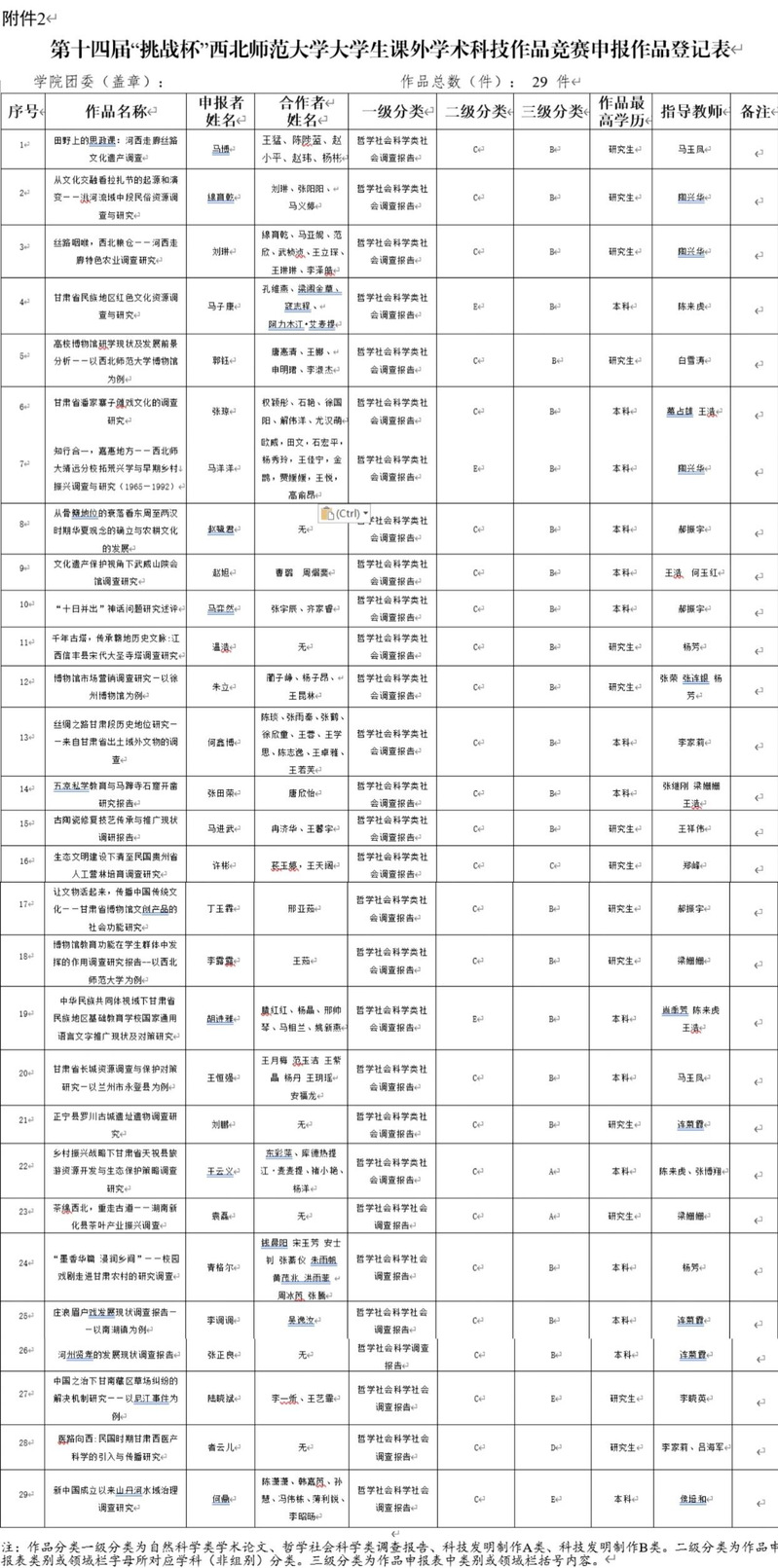 为深入贯彻党的二十大精神,提升学生的创新能力、发扬学生的创新精神,深入实施科教兴国战略、人才强国战略、创新驱动战略加快实现高水平科技自立自强、加快建设科技强国贡献青春力量,2025世俱杯官网开展了第十四届“挑战杯”甘肃省大学生课外学术科技作品院级竞赛评选。学院本、研学生积极报名参加,经过层层选拔与学院匿名评审,共推荐29件作品至校级比赛。其中共有本科生作品15件、研究生作品14件。