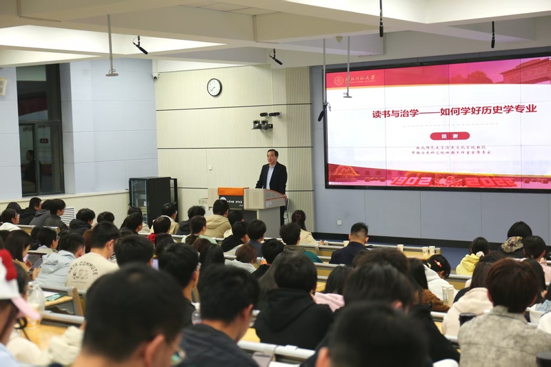 讲座中,田澍教授围绕学习历史的重要性、专业素养的形成、文献研读的基础性、成果梳理的精准性、见解表达的严密性等五个方面展开,为新生系统阐述了历史学专业的治学路径与方法,引导同学们奠定坚实的专业基础。田澍教授以其渊博的学识和深入浅出的讲解,整场讲座内容丰富、逻辑严密,赢得了在场同学的阵阵掌声。