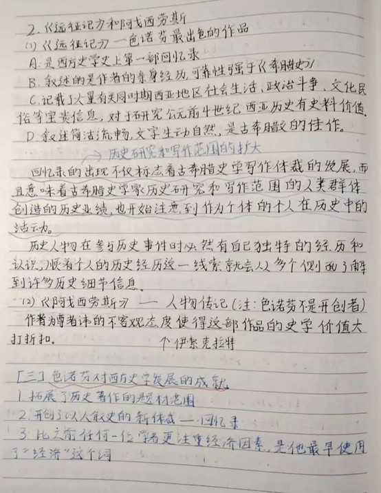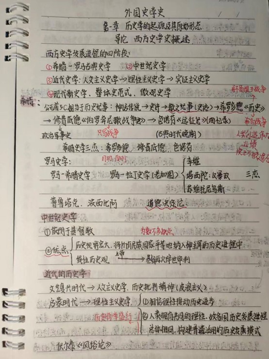 这是尚滢同学的作品,字迹工整规范,笔画清晰,排版整齐,体现出良好的书写习惯,对西方史学发展阶段、古希腊罗马史学脉络梳理清晰,重点突出,批注精准。