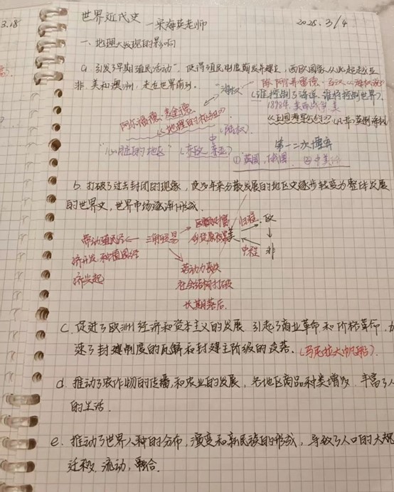 这是黄艳青同学的作品,书写具有一定的连贯性,地理大发现的影响分类详细,逻辑清晰,关联相关理论和历史事件,拓展了知识的深度和广度。