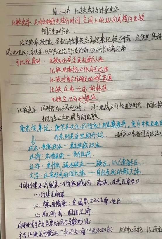 这是23级王浩同学的作品,字迹流畅自然,重点内容的红笔标注醒目,比较史学的概念、原则和应用场景阐述明确,知识融合性强。