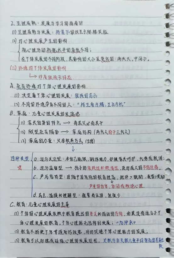 这是白书华同学的作品,字迹工整,书写平稳,对专业知识的记录在字迹上表现出认真的态度,关于心理发展影响因素的笔记,结合实验、案例和分类说明,理论与实际结合紧密,知识讲解透彻。