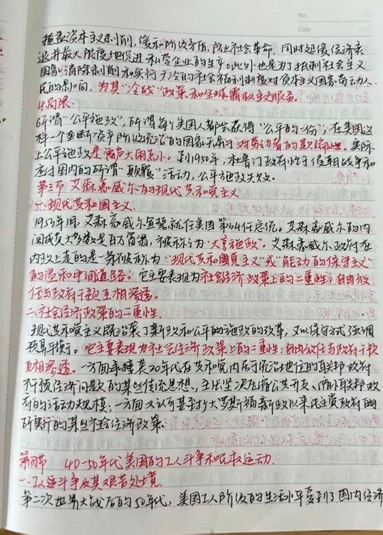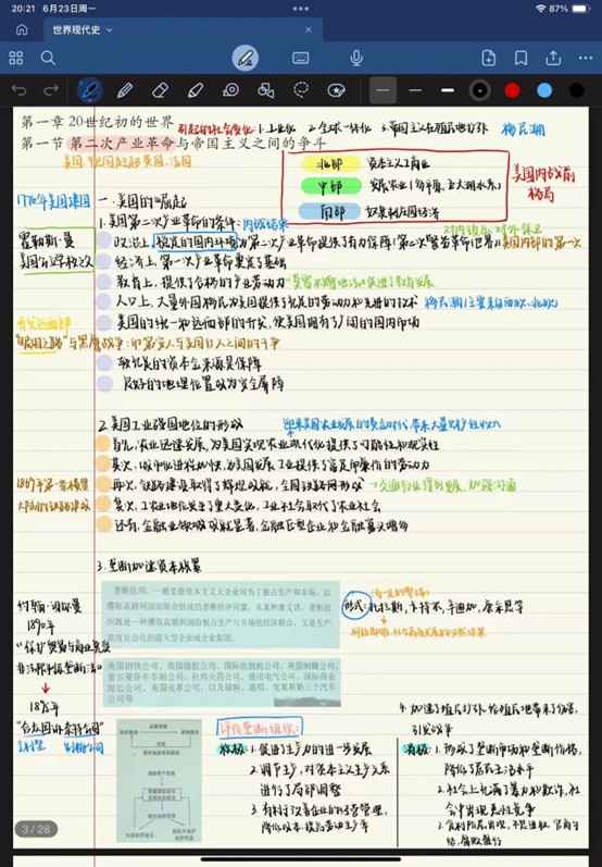 这是陈欣悦同学的作品,笔记清晰易读,色彩搭配和字体大小运用得当,视觉上较为舒适。采用色彩标注和分点阐述,美国崛起的背景、过程和垄断资本积累等内容层次分明,视觉化呈现利于记忆。