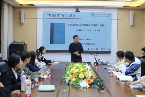 本次读书会特邀宋史研究领域新锐学者——缪喜平副教授来带领学生走进“文治煌煌,鼎革叠起”的宋史。缪老师以“什么是好的学术书?”为切入点,结合邓广铭、田余庆等史学大家的经典著作,阐述了学术研究的价值与方法论。他强调,优秀学术作品需兼具问题意识与创新视角,并以邓小南教授的《祖宗之法·北宋前期政治述略》为例,系统解析该书的写作背景、核心观点与学术影响。邓氏指出:“祖宗之法是动态积累而成、核心精神明确稳定而涉及面宽泛的综合体”,其牵动着宋代政治文化、人事制度、士大夫风气等层面,主要目的在于保证政治格局与统治秩序的稳定。邓氏在研究过程中,考察重点考察宋初三朝乃至仁宗前期“祖宗之法”逐步在朝廷上正式提出及其神圣化的过程,借以观察“祖宗之法”进入主流话语体系后,对两宋政治的影响。屏幕上同步展示相关史料与研究成果,增强了内容的直观性与感染力。